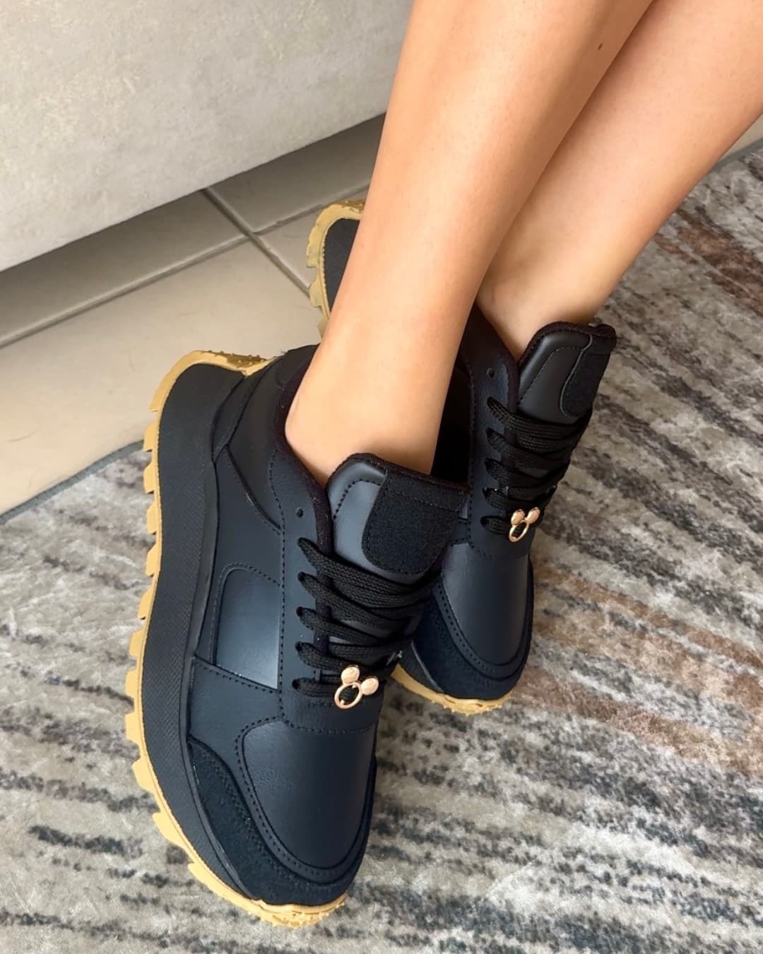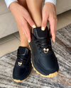 Tenis negros estilo deportivo con suela en tono camel y un charm. El diseño combina comodidad, un toque moderno y divertido, ideal para un look casual con personalidad.